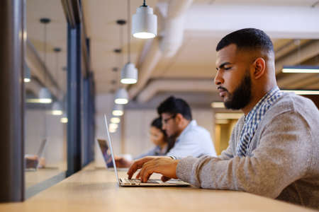 Young handsome black man concentrated focused to his laptop and working in serious mood in a modern office, copy space.