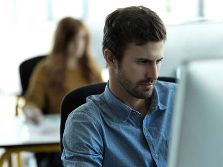 Portrait of a young man sitting at a table in the office and working on a computer. Co-working, business. Business and entrepreneurship concept