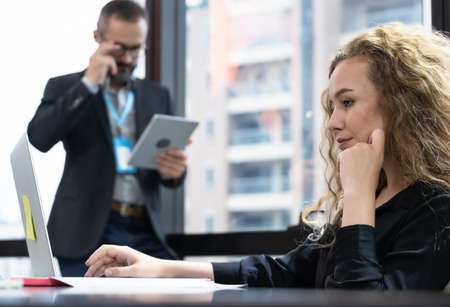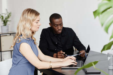 Young serious businesswoman typing on laptop while sitting by table in office against confident colleague with financial papers looking at her