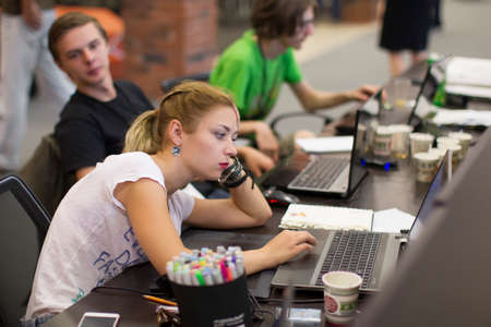 Belarus Minsk 06 August 2016 The Park of High Technologies. Competitions programmers.A woman at the office is working at the computer. Student at the computer