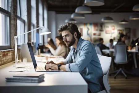 portrait of a young man looking at pictures on his laptop while working in the office, created with generative ai