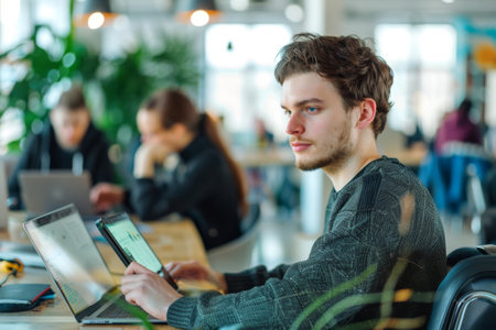 A young man working on a laptop in a modern office environment, with large windows and natural light, colleagues in the background engaged in discussions
