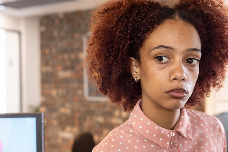 African American woman working at office desk against exposed brick wall using computer monitor. Professional, workspace, contemporary, corporate, collaborative, stylish, productive