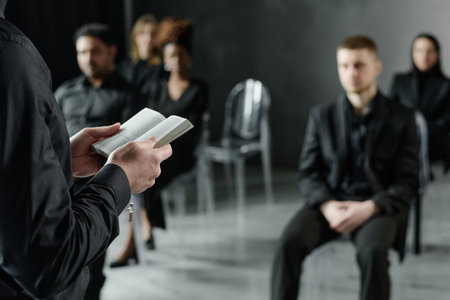 Caucasian man holding open book reading aloud to diverse group of adults and young adults sitting on chairs listening attentively in formal setting, focus on speakers hands