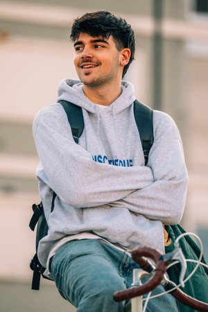 Young guy in a black jacket with a phone sits on the seashore. Man takes a selfie near the sea.
