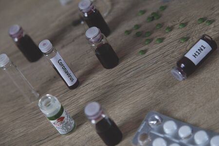ampoule of coronavirus and drug on table