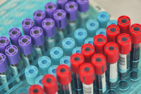 Blood sample in tubes, collected from patients. Close up view.