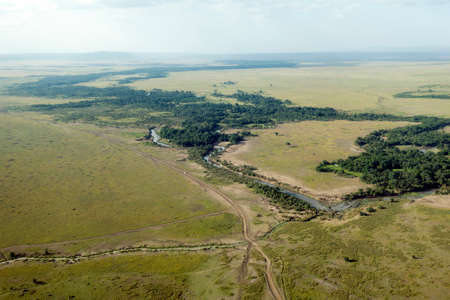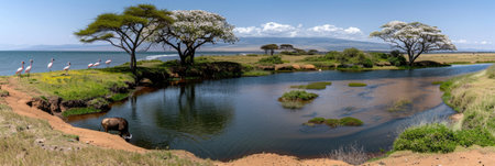 Tranquil river meandering through the expansive african savannah, bordered by lush greenery and scattered acacia trees under a bright blue sky. grazing wildlife completes this idyllic natural scene. Generative AI