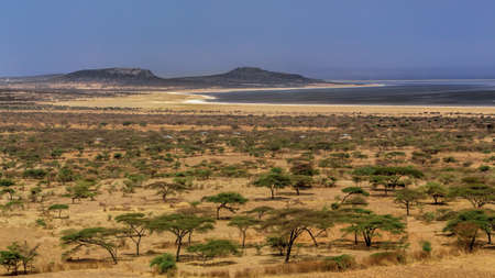 Panoramic view the Abyata lake in Oromia region of Ethiopia, with mountains in the far distance and savannah grass lands with sparsely placed trees