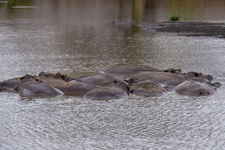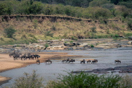Wildebeest (Connochaetes caffer) crossing the Mara river in Kenya, Africa