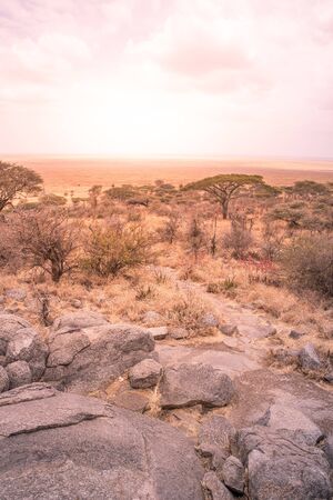 Panorama view to the beautiful bush savannah of Serengeti at sunset, Tanzania - Safari in wilderness of Africa