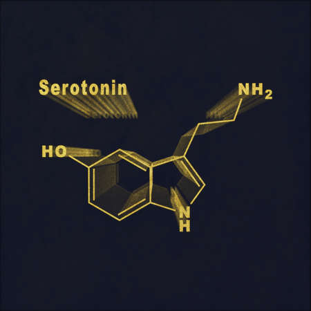 Molecule Of Serotonin. 3D model of a neurotransmitter serotonin represented in form of a schematic molecular structure freely levitating among of other organic substances. 3D rendering graphics.