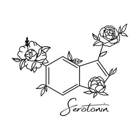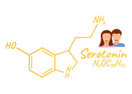 Human hormone serotonin concept chemical skeletal formula icon label, text font vector illustration, isolated on white. Periodic element table. Healthy lifestyle endocrine system.