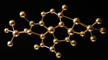A detailed golden molecular structure network set against a black backdrop highlights complex connections and forms.