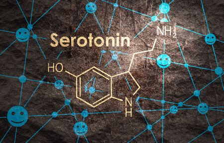 Serotonin structural chemical formula, Hand drawing with a chalk on a blackboard, School chemistry class. Happiness hormone model