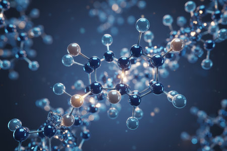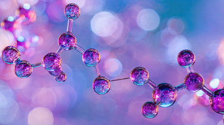 This image features a detailed illustration of a molecular structure, rendered with vibrant colors and interconnected spheres. The background presents a blurred bokeh effect, suggesting depth and adding a dynamic visual appeal. The style leans towards a modern, artistic representation suitable for educational materials or scientific visualizations, offering potential applications in design or editorial projects.