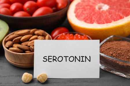 Many different products and card with the word Serotonin on table, closeup. Natural antidepressants