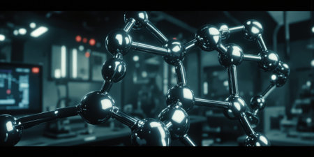 A sleek 3d visualization featuring interconnected hexagonal forms and shiny metallic spheres symbolizing atoms, set against a textured dark backdrop for a futuristic