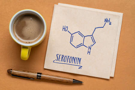 serotonin molecule chemical structure, one of brain happiness chemicals - rough sketch on a napkin with a cup of coffee, chemistry and physiology concept