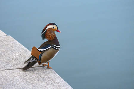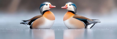 Breathtaking Scene of Colorful Mandarin Ducks Floating Gracefully on a Misty Pond at Dawn