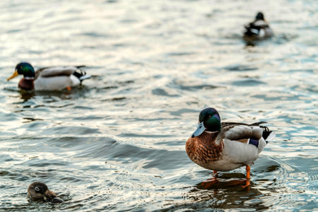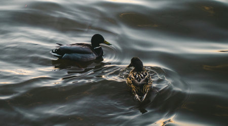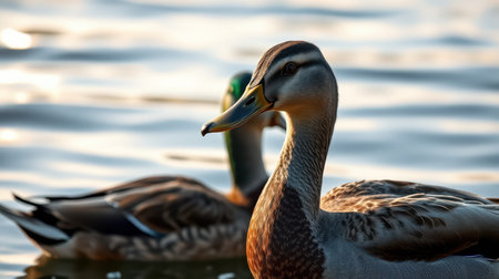 Ducks swimming gracefully in a serene lake during the golden hour of late afternoon