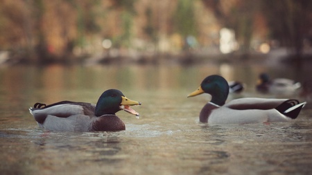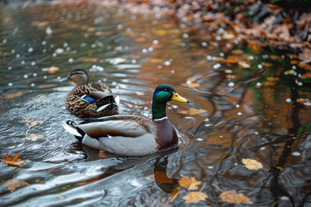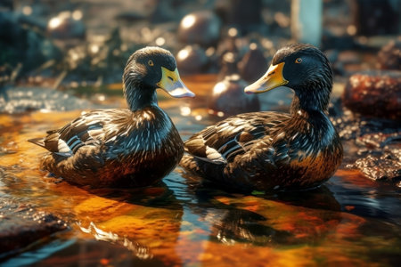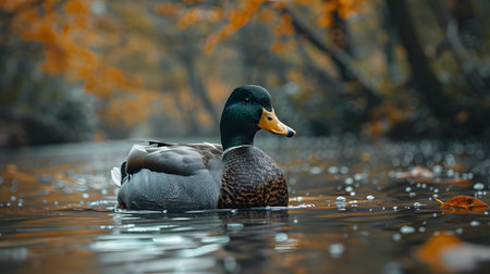 Ducks swimming peacefully in a forest stream during autumn. Golden sunlight filters through the trees, creating a serene atmosphere.