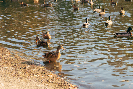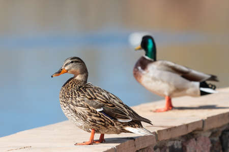 Close-up picture of brown female duck walking on stone seafront with unfocused male duck drake following it near river with green water in sunny summer day. Birds and wildlife concept.