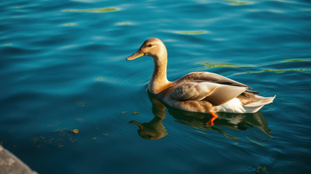 Mallard duck swimming gracefully on a calm lake during the afternoon light