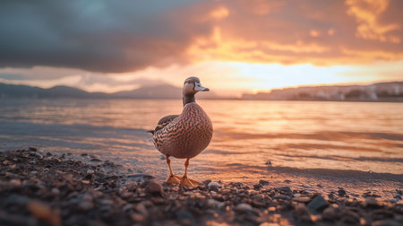 A colorful duck swims gracefully on shimmering water amidst a stunning sunset backdrop.