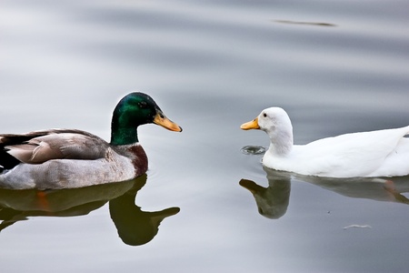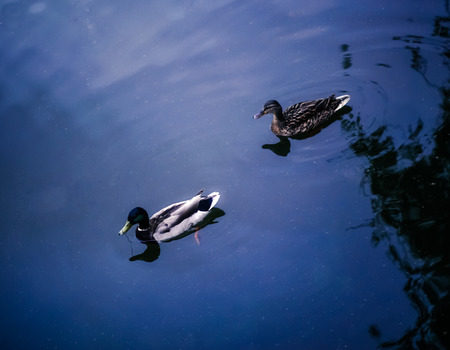 Ducks with feathers covered in oil in water polluted with waste and debris. The problem of waste water discharge and oil spills in lakes, rivers, seas and oceans - habitat of seabirds.