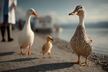 A serene moment captures a family of ducks at a pond, with a curious duckling gently exploring the water's edge, showcasing nature's tranquility.