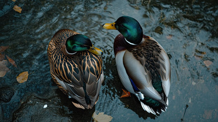 Beautiful mallard duck resting peacefully by a pond in autumn, showcasing its vibrant plumage and serene demeanor