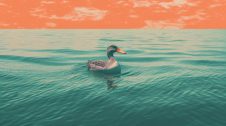a duck floating in water, showcasing a vaporwave-inspired aesthetic with a blend of light cyan and orange hues. the image captures muted seascapes and vintage imagery, featuring a realistic hyper-detailed rendering. the use of kodak elite chrome extra color enhances the vibrant colors, creating a romanticized portrayal of nature. ai generated