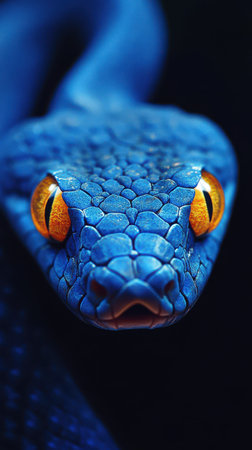 Bright blue snake with striking yellow eyes against a dark background showcases unique scales and features