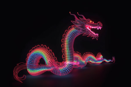 3D rendering of a colorful neon dragon on a black background.