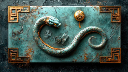 An ornate bronze plaque featuring a serpentine design and intricate borders, showcasing artistic craftsmanship and aged patina.