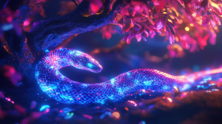A snake adorned with vibrant, glowing patterns moves gracefully among shimmering plants. The nocturnal environment is filled with colorful lights and enchanting, mystical colors.
