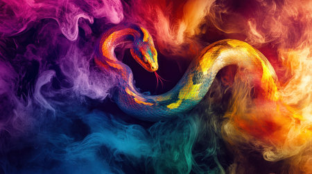 Colorful snake in vibrant smoke, showcasing stunning patterns and hues against a dark, dramatic background, ideal for capturing attention in artistic and wildlife contexts