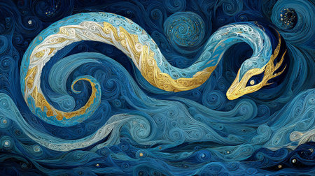 fantastical sea creature resembling snake emerges from ocean waves.