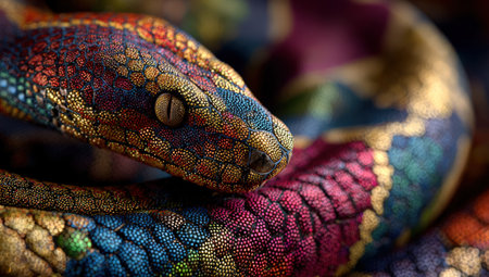 Vibrant snake with detailed scales, coiled gracefully against a soft background, emphasizing its colorful patterns and natural elegance in a captivating display