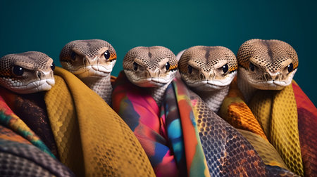 Creative animal concept. Gang family of snake in vibrant bright fashionable outfits, commercial, editorial advertisement, surreal surrealism. Group shot.