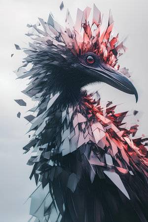 3d rendering of a black raven with red and black feathers.