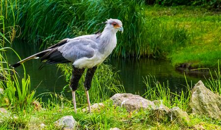 closeup of a secretary bird standing at the shore, vulnerable animal specie from Africa