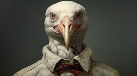 a white bird, adorned with a white tie and bowtie, reminiscent of the artistic styles of david michael bowers, zbrush, hendrik hondius, and dino valls. this characterful animal portrait captures the raw and confrontational essence of these artists' works, with a color palette dominated by dark beige and red tones. ai generated