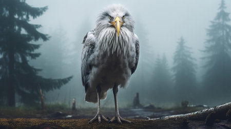 a giant seagull, with an uncanny resemblance to a sabretooth, stands majestically in a foggy forest background, its thin yet imposing figure accentuated by its long legs, while its ugly eyes seem to convey a sense of illness, captured in a stunningly realistic photograph. ai generated
