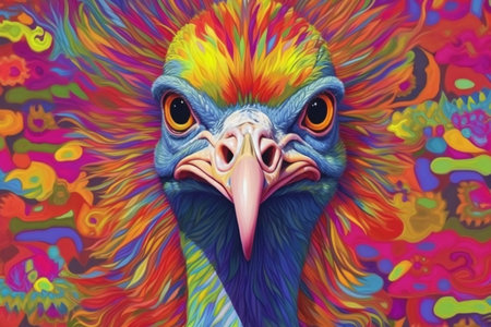 Portrait of a colorful bird on a colorful background. Psychedelic painting.