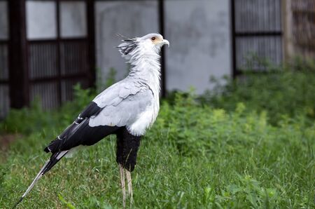 Bird Secretary Sagittarius serpentarius walking in the park. The secretarybird is instantly recognizable as a very large bird with an eagle-like body on crane-like legs.