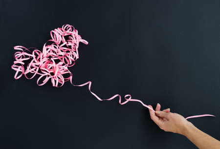 Female hand holding pink curly ribbon heart. Serpentine heart.