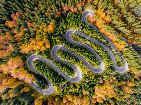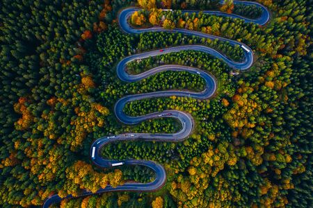 Scenic curvy road seen from a drone in autumn. Cheia, Romania.