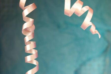 Colored serpentine on a pink background. Holiday, birthday background. copy space